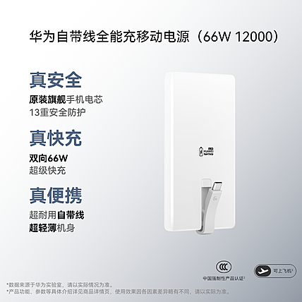 Huawei/华为自带线全能充移动电源(66W 12000)充电宝 3C认证 可上飞机 旗舰手机电芯适配Mate80系列