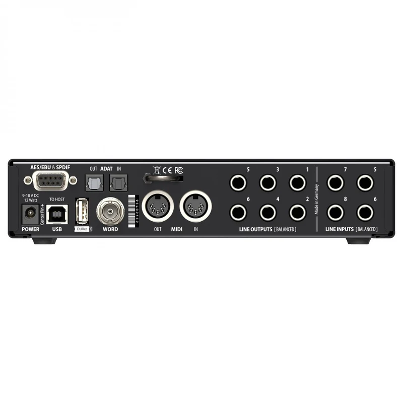在数字端,该 USB 2.0 接口包含八个通道的 ADAT I/O、AES/EBU 和 S/PDIF I/O。此外,MIDI I/O通过两个5针DIN连接器和可切换字时钟实现,用于同步其他数字处理器。